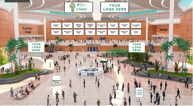 The JA Inspire Virtual program takes place in a rich virtual environment that mimics the dynamics of a physical live event, including a virtual lobby, information booth, auditorium for presentations, and halls with booths and sponsors. Within the virtual experience, students attend webinars and presentations, explore career booths, and interact with career speakers.